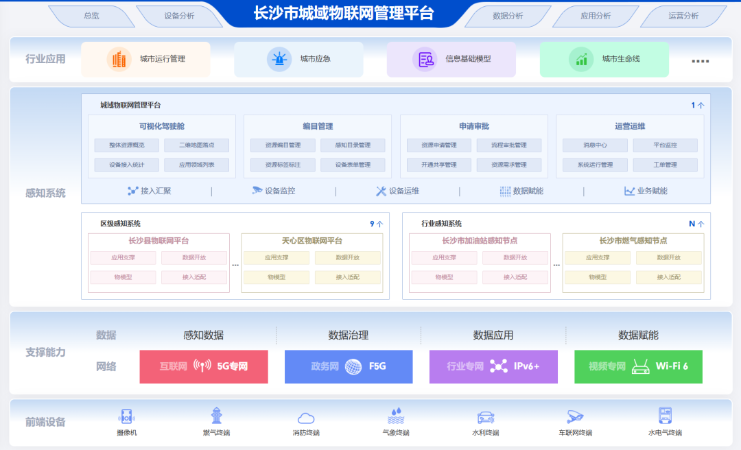 长沙市城域物联网管理平台:作为物联感知数据的总汇聚、感知能力供应总平台,提供物联感知数据加密脱敏、算法、预警模型等基础能力供应。