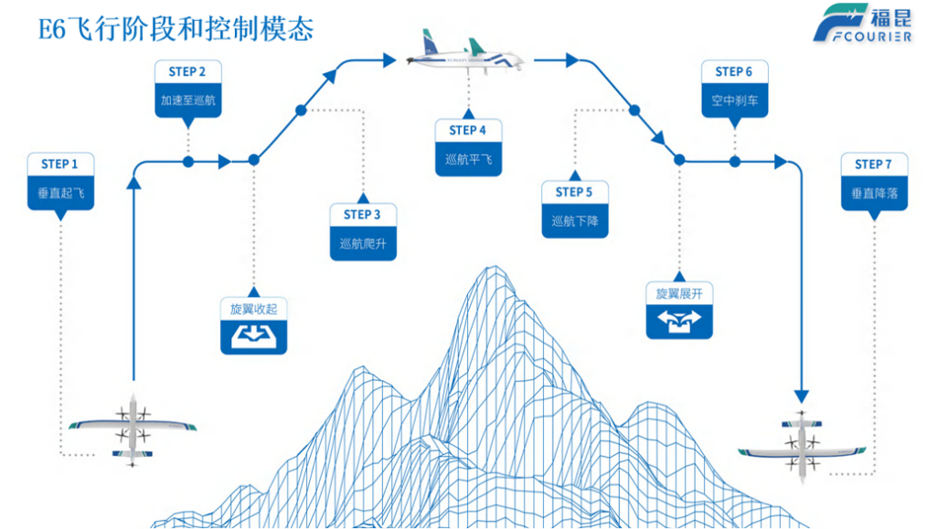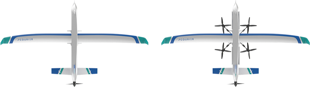 图2 E6A型无人机可变翼布局与两套动力系统方案,图左无人机旋翼收起,图右无人机旋翼展开。