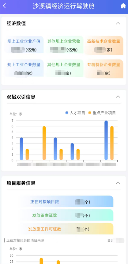 ③经济运行:聚焦规上/专精特新企业数量、企业诉求解决、重点产业项目与预算收入等关键指标,全面汇聚了经发、企服中心、农工等核心部门的9大类、33小项经济数据,实现了区域经济态势的“一屏洞察”,成为精准把脉经济走势、科学制定产业政策的核心仪表盘。