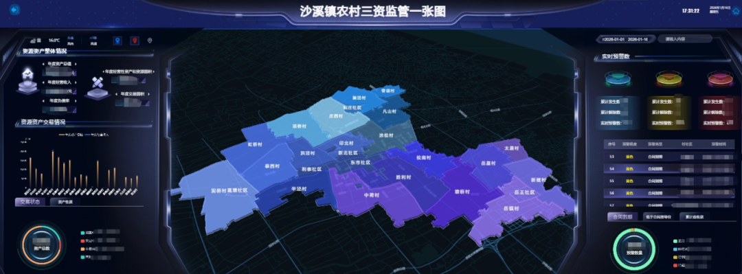 农村三资监管聚焦资产总值、经营收入、负债率等核心指标,深度融合实时预警数据与类型分析,实现资源资产全景可视化与风险动态感知,助力领导精准掌握三资监管成效与进展,提升决策指挥效能。