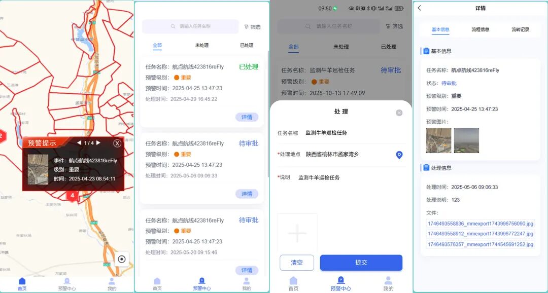 APP整合个人中心、问题统计、机场地图等核心模块;支持个性化设置、监测数据统计,联动综合管理平台,实现“预警-导航-核查-反馈”全流程数字化管理,具备分级任务派发、标准化取证功能,形成“一案一档”闭环体系,如图8所示。