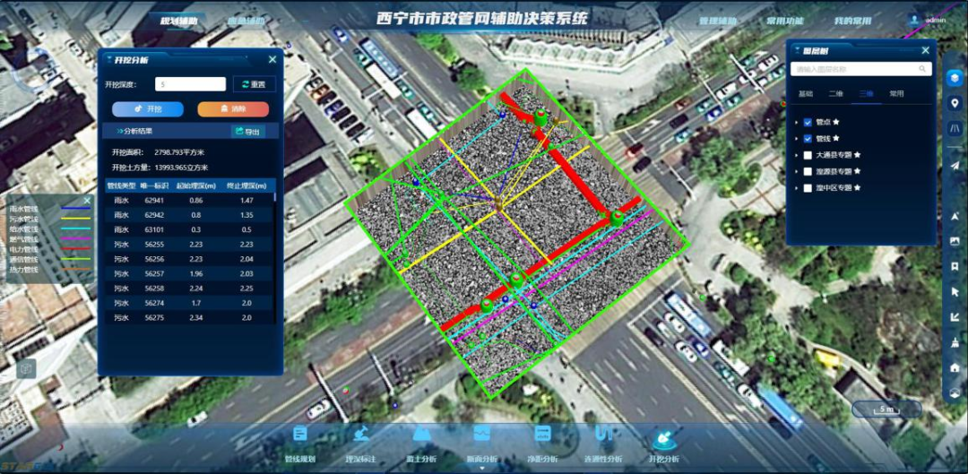 某道路改造工程中,辅助决策子系统提供管线断面、流向分析及开挖模拟,精准呈现地下管线分布,有效避免施工挖断管线事故,减少重复勘察成本,缩短工程建设周期,保障城市交通与管网运行安全。
